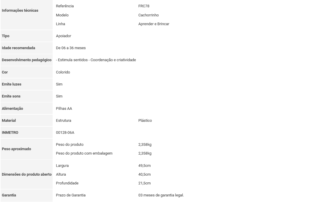 Ele tem 2 formas de brincar conforme o bebê cresce: sentado ou andando. O nariz e as teclas do piano acendem, e há peças que giram, rolam e dá até para virar as páginas! São mais de 75 músicas, sons e frases, que ensinam conceitos introdutórios sobre o alfabeto, formas, cores, números e muito mais. O conteúdo educativo muda conforme a idade e a fase do bebê, através da tecnologia Smart Stages. A alça dá firmeza aos primeiros passos do bebê.