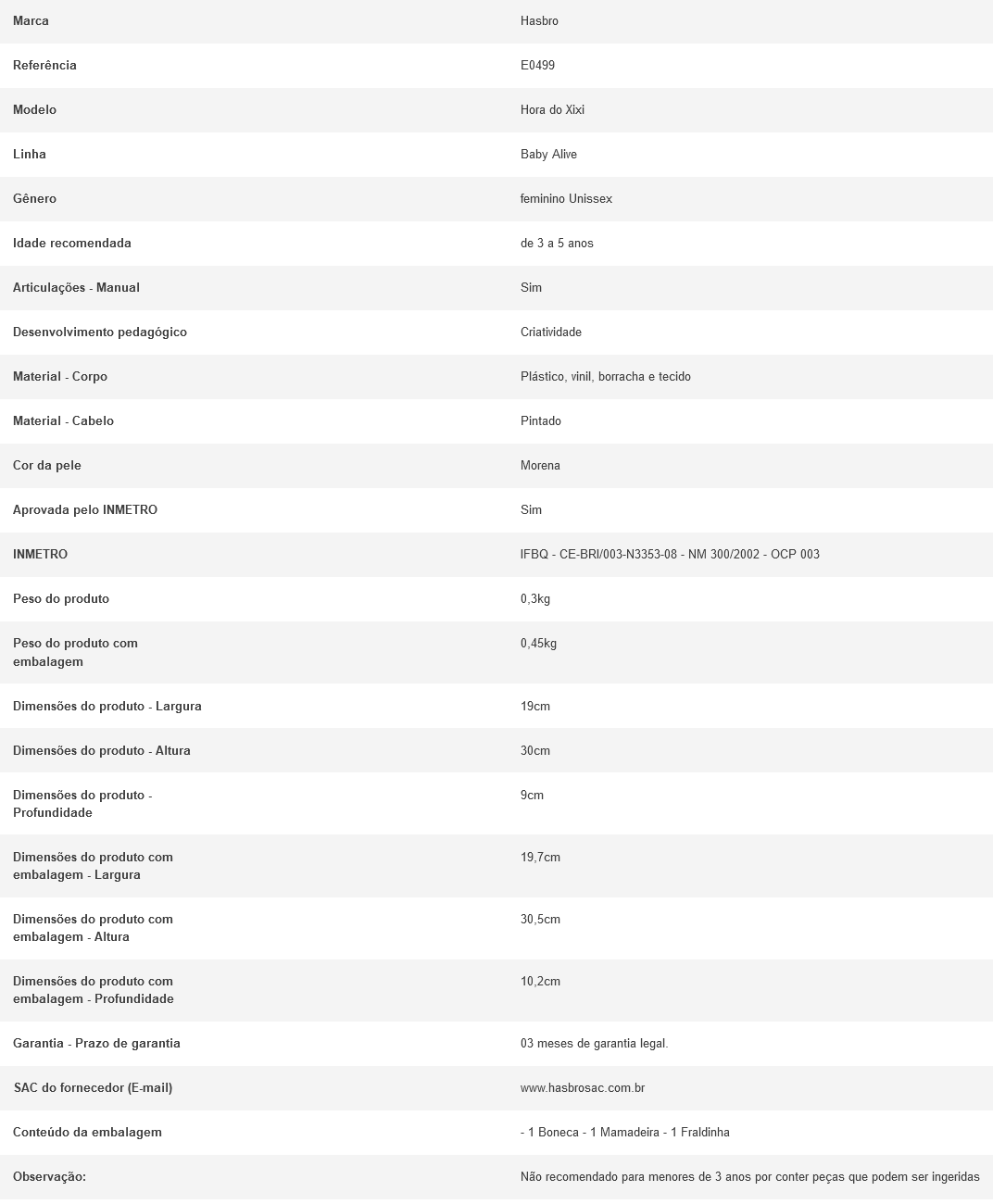 Divirta-se com essa boneca incrível! A Boneca Baby Alive Hora do Xixi da Hasbro vem com acessórios e vai garantir altas diversões. Dê água na mamadeira para ela beber e ela vai fazer xixi de verdade na fraldinha. Ela está sempre pronta para brincar. Você irá adorar trocar, cuidar e alimentá-la como se fosse um lindo bebê de verdade.Tudo isso com a certificação do INMETRO.